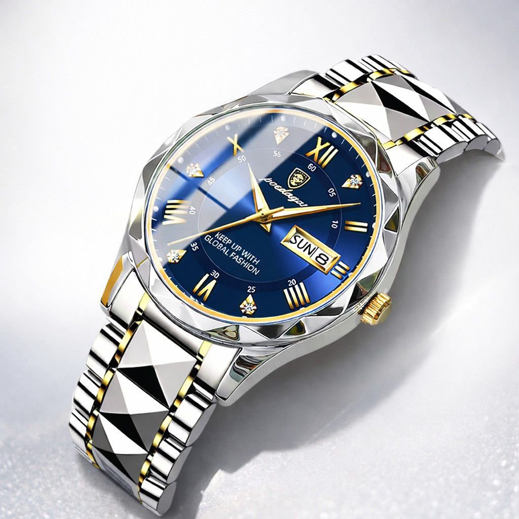 این ساعت لوکس با صفحه آبی جذاب، اعداد رومی طلایی و بند فلزی مقاوم، جلوه خاصی به شخصیت شما میبخشد. دارای نمایش روز و تاریخ برای استفاده آسان و کاربردی.
